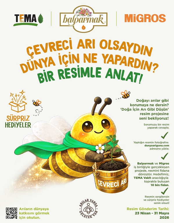23 Nisan – 31 Mayıs 2026 tarihleri arasında çizdikleri resimleri www.dunyaarigunu.com adresine yükleyen her çocuk için TEMA Vakfı’na fidan bağışı yapılacak. Önceki yıllarda olduğu gibi Dünya Arı Günü kapsamında projeye katılan çocuklar adına 10 bin fidanlık bir hatıra ormanı oluşturulması hedefleniyor.